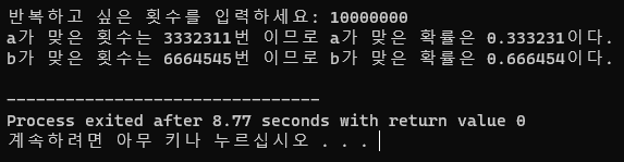 printf("a가 맞은 횟수는 %d번 이므로 a가 맞은 확률은 %.6f이다.\n",a_total,a_result);//소수점 6자리까지 확률을 출력